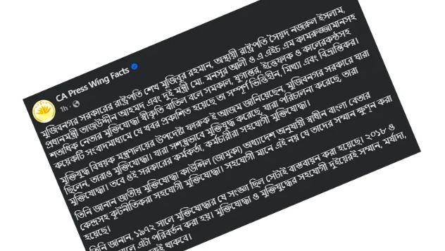 বঙ্গবন্ধু শেখ মুজিবুর রহমান, তাজউদ্দীন আহমদ, মো. মনসুর আলী ও এএইচএম কামারুজ্জামানসহ শতাধিক নেতার মুক্তিযোদ্ধা স্বীকৃতি বাতিল নিয়ে প্রকাশিত সংবাদকে সম্পূর্ণ ভিত্তিহীন, মিথ্যা এবং বিভ্রান্তিকর বলে উল্লেখ করেছে প্রধান উপদেষ্টার প্রেস উইং।